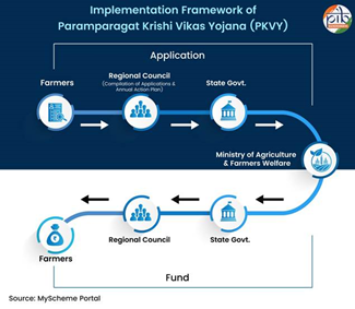 • PKVY promotes organic farming in India through a cluster-based approach, empowering groups of farmers to adopt chemical-free, eco-friendly practices for better soil health and food safety.