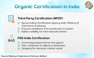 • Large Area Certification (LAC) streamlines organic certification in non-chemical farming regions, integrating with the National Mission on Natural Farming (NMNF) for broader sustainable agriculture impact.