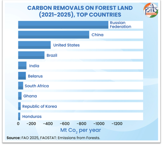 • India ranked 5th among global carbon sinks, absorbing 150 Mt CO₂/year (2021–25).