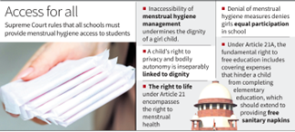 - SC directed States and UTs to ensure free sanitary napkins in government and private schools.