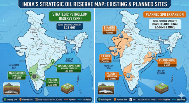 • Goal: Once Phase II is complete, India’s SPR capacity will rise to 11.83 MMT, providing approximately 22 days of independent crude cover.